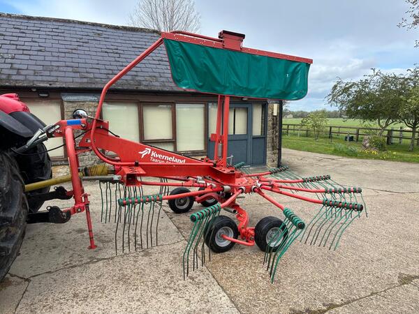 Kverneland 9142 single rotor rake in good condition. Year 2011, 4.2 metres working width, bogie axle, hydraulic height adjustment, straight tine arms and good tines
