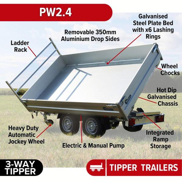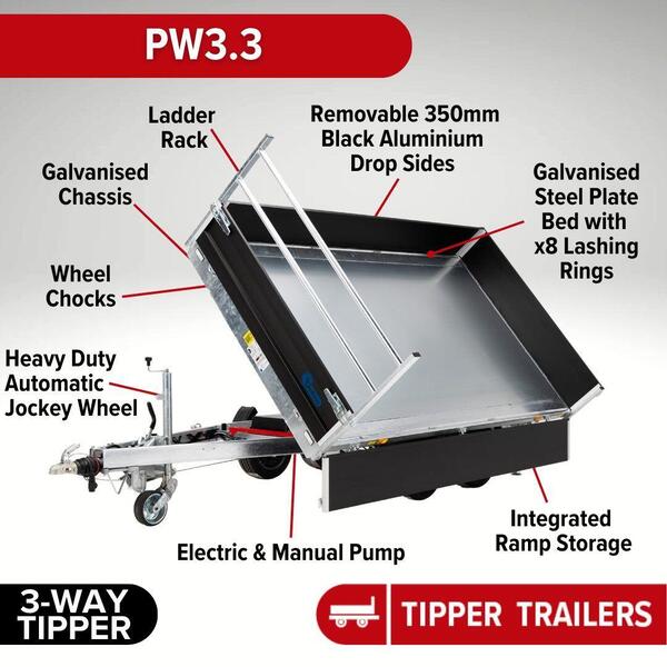 The PW3.3 is a versatile Double Axle Tipper Trailer featuring Three-Way Electric Tipping (3 way electric hydraulic cylinder pump), handling a Maximum Gross Weight of 3500kg. Sporting exclusive black drop sides, du...