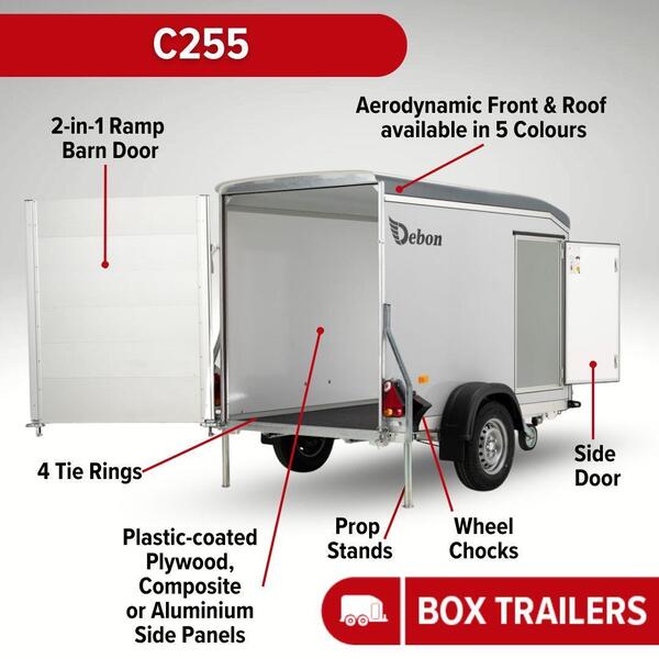 For all prices on this model, please see below. The Debon C255 is a lightweight single axle box van trailer with a maximum gross weight of 1300kg. The trailer features a one-piece aerodynamic front and roof manuf...