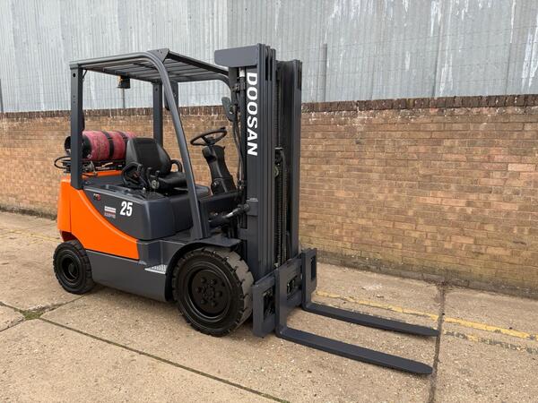Doosan D25S-5 With 7735 Hours. Lifts 2.5 Tonne, Max Height 4.7M, Turning Radius Of 2.26m, Triple Free Lift Mast, Container Spec. Supplied With Pallet Forks.