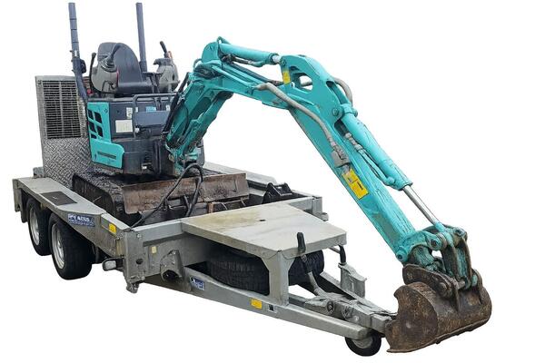 Kobelco Mini Digger SK10SR with manual quick hitch. 4 buckets and expandable tracks Hardlife Essential Hydraulic Breaker 156 hrs still in use The Digger comes with a 6 month old Ifor Williams GX84 Plant Trail...
