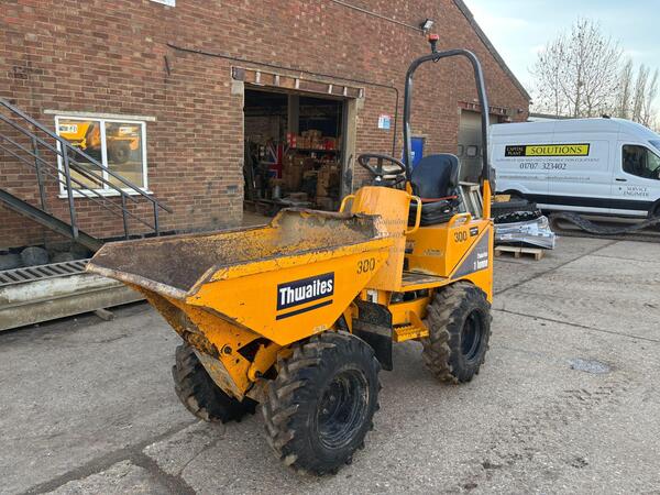 Thwaites 1 Ton High Tip Dumper MACH201. Good condition. Folding ROPS, flashing beacon, immobiliser, reverse alarm, straight skip and chassis, although the rear lip of the skip is bent, with good paintwork for it...