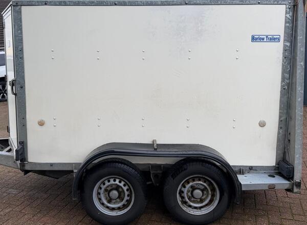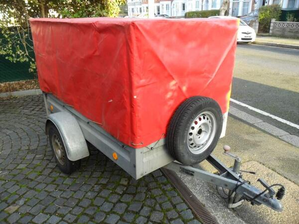 Stema single-axle covered car trailer. 700 kg load. Internal dimensions 2050 long x 1120 wide x 1120 high (6'9" x 3'8" x 3'8" approx.) Waterproof cover. (Cover and frame easily removable to use as an open trailer ...