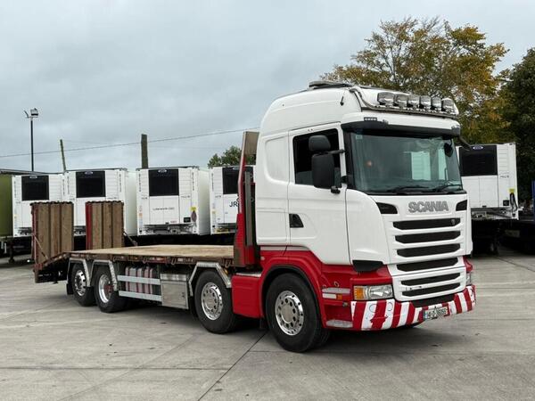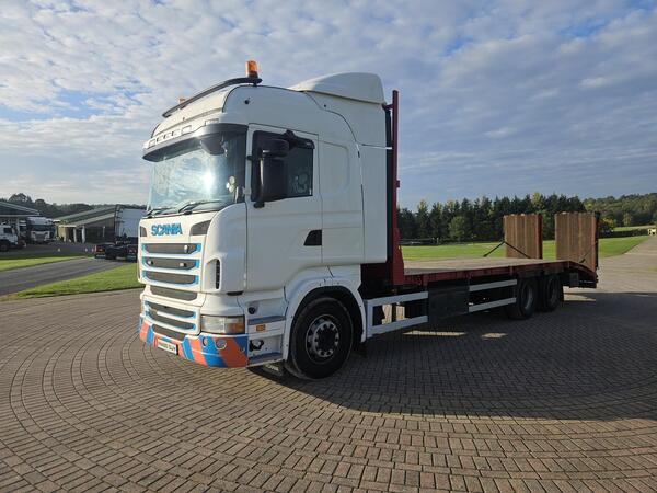2012 Scania G440 8x2 Rear Lift Highline Sleeper Cab Flatbed Beavertail. 12 Speed Opticruise Gearbox. Winch. Flip Toe Hydraulic Ramps. Strong Wooden Floor. Side Toolboxes. Radio/Stereo. Twin Bunk. Excellent Conditi...