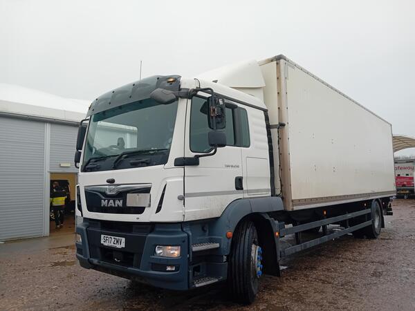 MAN TGM 18.250 – EURO 6 (71) 2021 – 18-ton GVW 28 ft Box Body 1500 kg Column Tail Lift Roller Shutter Doors Air Suspension Full Air Kit Air Conditioning Sleeper Cab Automatic Gearbox Approx. 215,980 km Date Regist...