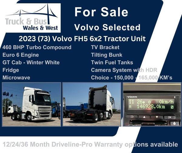 π₯ Volvo Selected β Low KM, High-Spec FH5π₯ β 2023 (73) Volvo FH5 6x2 β 460 BHP "I-Save" Turbo Compound β Euro 6 Engine β GT Cab β Winter White β Choice of units: 155,000 KM β Excellent Condition β Extras & Com...