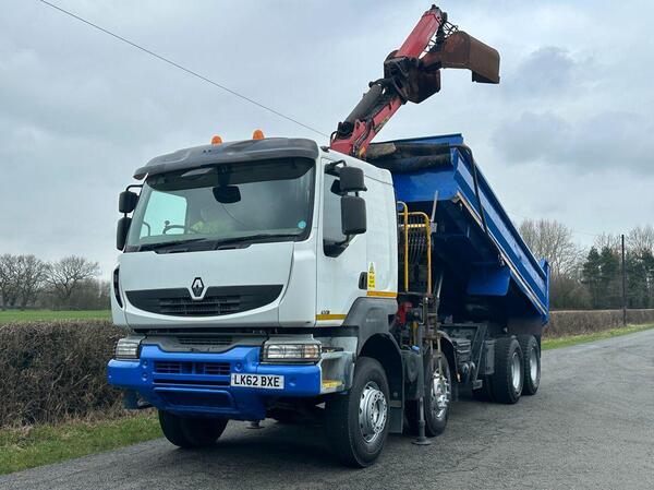 • 2012 Renault Kerax 430 8 X 4 Tipper Grab • Gross Vehicle Weight 32000 Kgs • 10.8 Litre 430BHP Turbo Diesel Engine • Automatic Gearbox • ABBA Steel Tipping Body • Edbro Hydraulic Tipping Gear • Palfinger Crane wi...