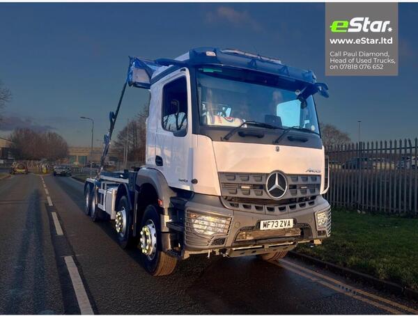 2023 Arocs 3243 day cab 8x4 fitted with Boughton hook equipment, easy sheet system, DVS system and strobe lights to the rear.