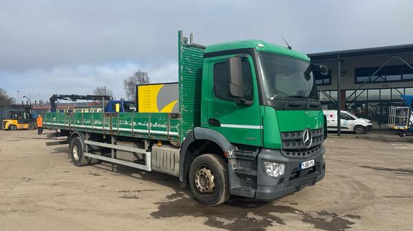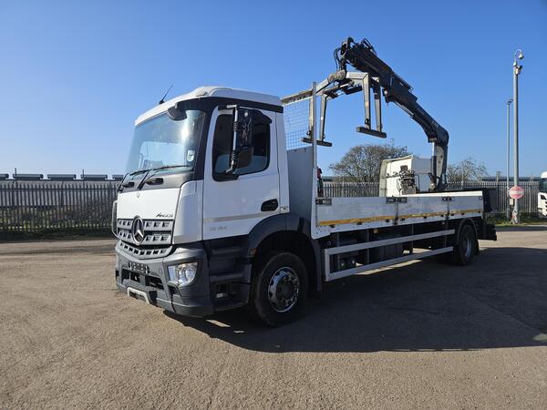 MERCEDES AROCS 1824 2017 (17) EURO 6, DAY CAB, 18 TON, 25FT 1 FLAT BODY C/W PALFINGER PK10000 CRANE, 2 EXTENSIONS, TOOL BOX, BEACONS, AUTO GEARBOX, REVERSING CAMERA, AIR SEAT, SUN ROOF, SWC, CRUISE CONTROL, ELECTR...
