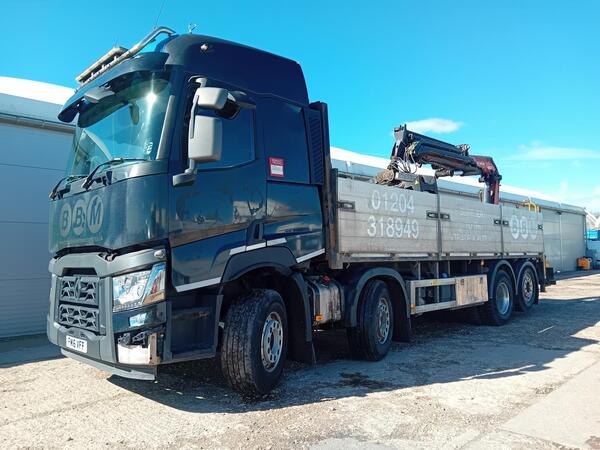 2021 21 RENAULT C380 EURO 6 6x2 rear lift/steer, 27ft flat bed, PM Serie 15.5 double extension remote control crane, tool box, up right exhaust, beacons, air horns, sun visor, camera system, audible indication, Au...
