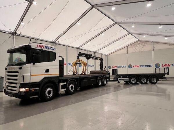 Scania 2014 (64) R 450 LB 6x2 MNA Drawbar and Trailer - 1,512,000Kms Featuring: Scania R Cab, High Cab 26 Ton Flat Bed 25'8'' Automatic Gearbox Nearside Camera System Nearside Large Tool Box Offside Tool Box Larg...
