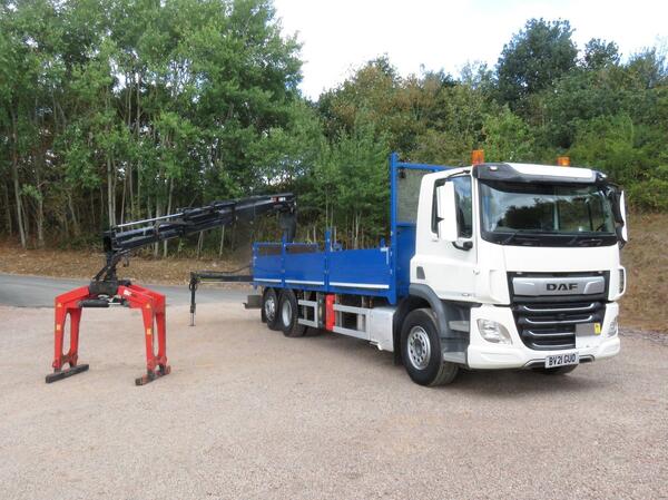 2021 21 DAF CF 340 ONLY 79,000 Kms Euro 6 - 6x2 Rear Lift & Steer Dropsided Flatbed with Hiab X-Hiduo 138 Remote Crane on 9 Ton Front Axle !! Day Cab AS Tronic Automatic Gearbox Air Conditioning Near Side Audible...